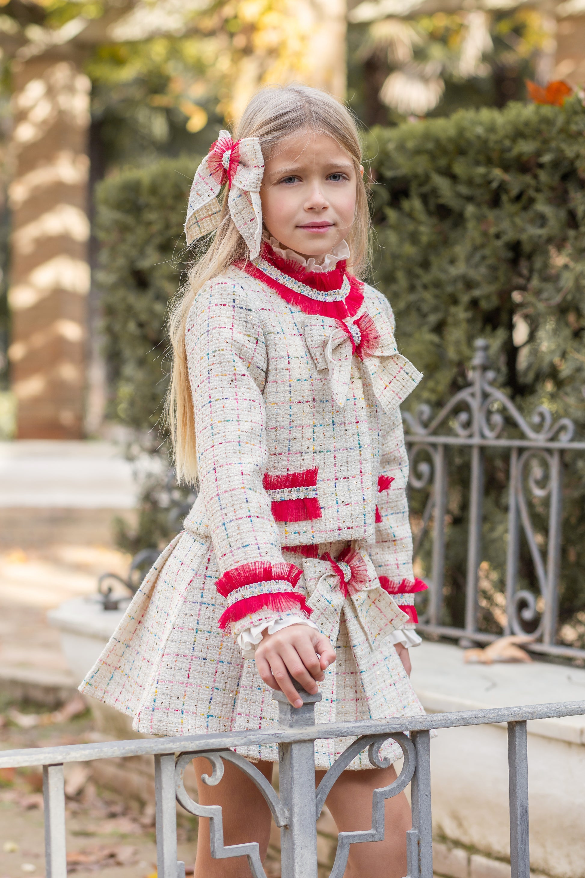 Matching pleated tweed skirt with coordinating bow and red trim to complete the ensemble