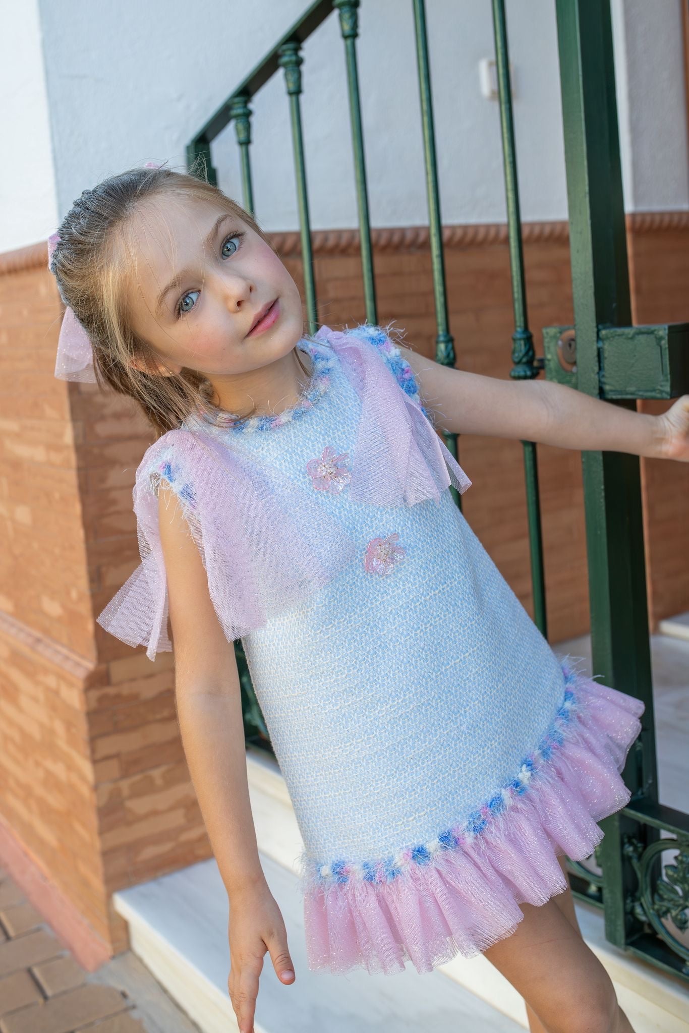 The Naxos Blue & Pink Tulle Tweed Dress is the perfect blend of traditional European charm and playful elegance. Designed in a soft pastel blue textured fabric, this beautiful dress features delicate pink tulle flutter sleeves and a matching layered tulle frill hem for added movement and volume.