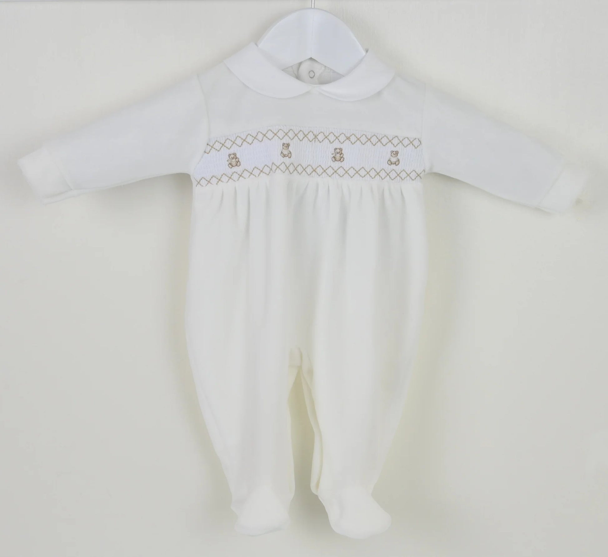 Pex Ivory Smocked Velour Teddy Sleepsuit | Prem to 3-6M