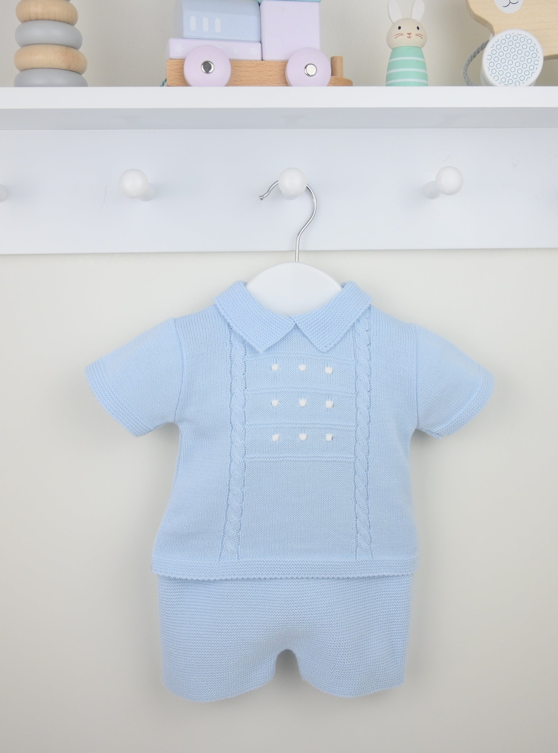 This beautiful two-piece knitted baby outfit is a timeless choice for little ones. Featuring a pale blue short-sleeved top with a smart Peter Pan–style collar, delicate cable-knit detailing and sweet raised dot embroidery across the chest, it’s paired perfectly with matching knitted shorts for a coordinated traditional look.
