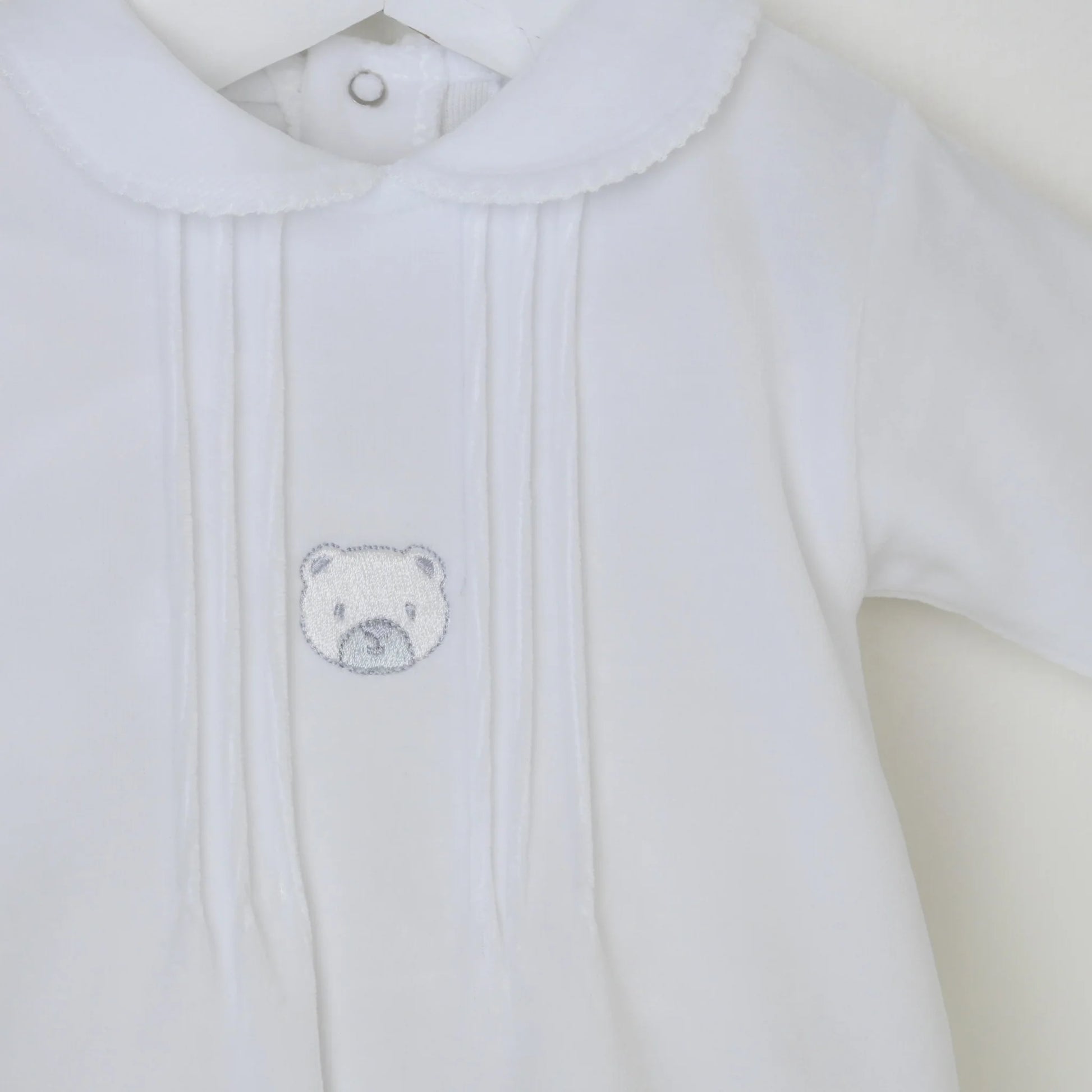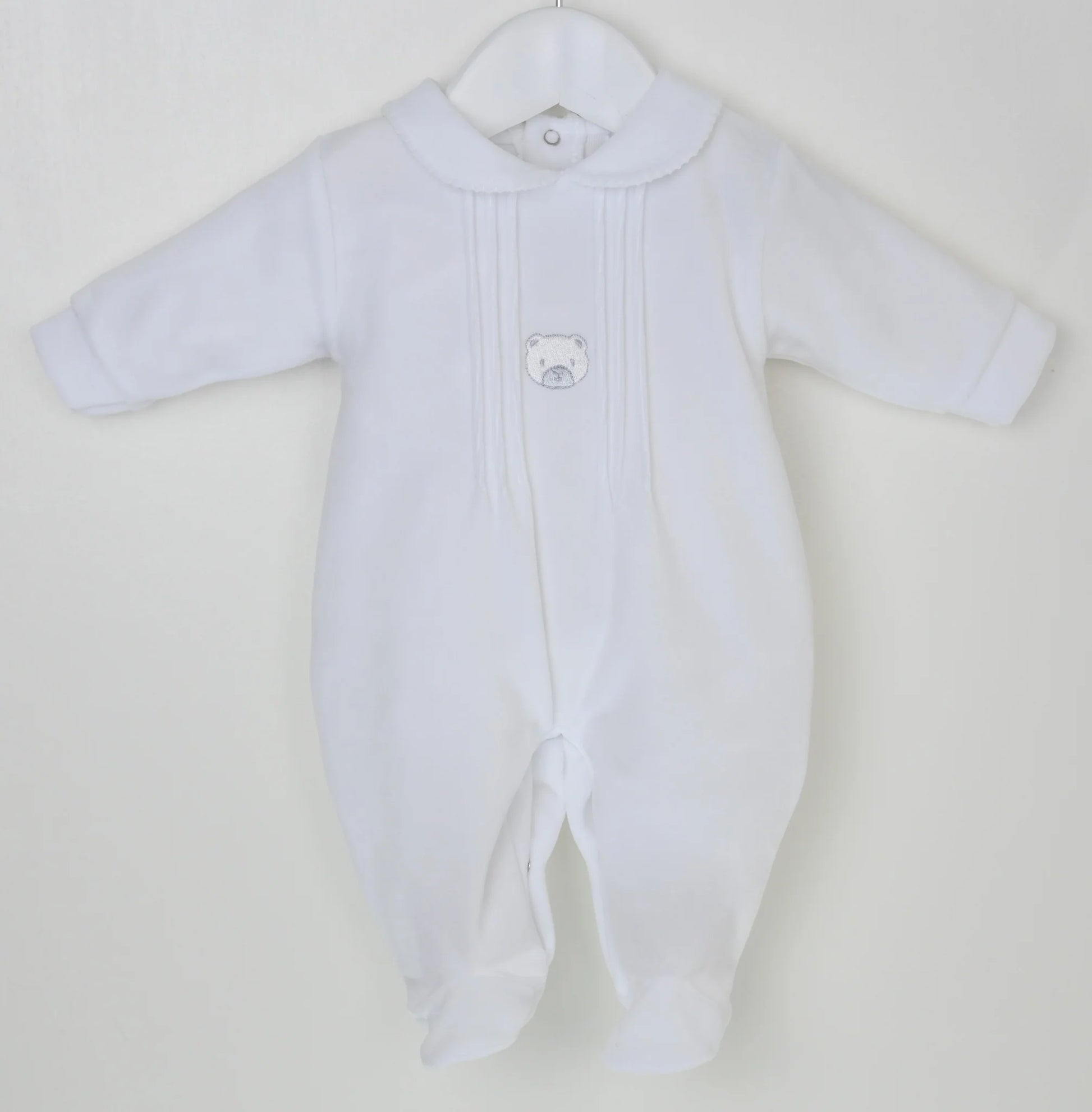 This beautifully soft white velour sleepsuit features a delicate embroidered teddy motif and elegant pintuck detailing to the chest, giving it that timeless, traditional look we all love at Little Stars. Finished with a sweet Peter Pan collar, it’s a gorgeous choice for newborn photos, coming home outfits and special keepsake moments.